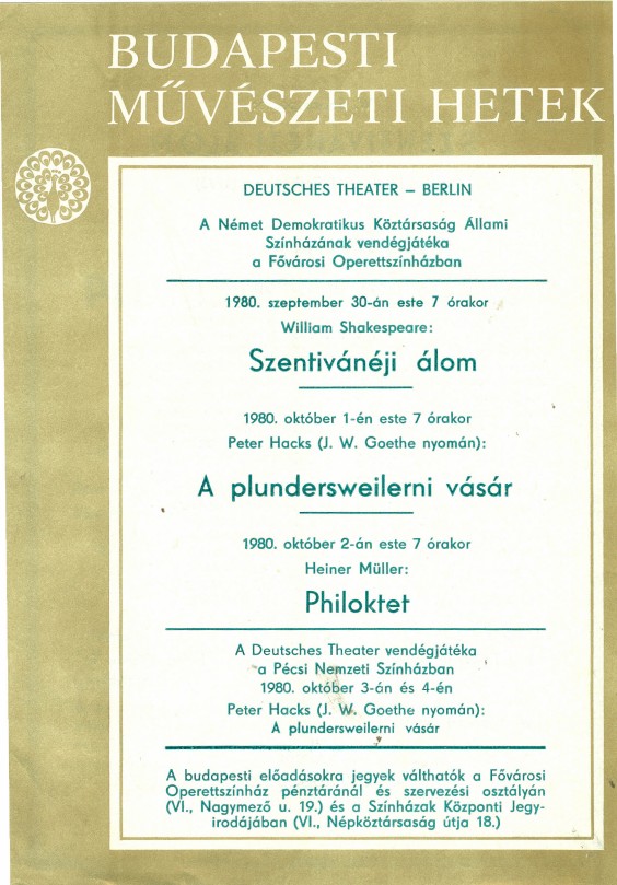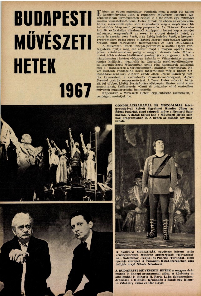 Mind a zenei, mind a színházi előadások lehetőséget nyújtottak külföldi művészek, társulatok meghívására. A szovjet, csehszlovák, román, lengyel és kubai társulatok színdarabjai mellett a Royal Exchange Theatre Company Shakespeare előadásait is láthatta a budapesti közönség. Mégis, inkább a hazai produkciókat próbálták középpontba helyezni. Új magyar zeneművek hangzottak el, új együttesek debütáltak. Megrendezték az új magyar operák hetét, és magyar filmpremierekben sem volt hiány.