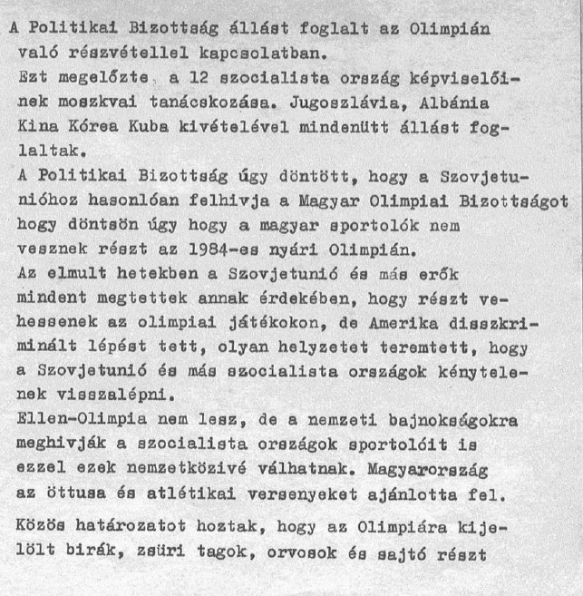 -Döntés a Los Angeles-i olimpiáról való távolmaradásról, 1984. május 15. MSZMP, Pártbizottság üléseinek jegyzőkönyvei. BFL XXXV.21.a/3. 7.