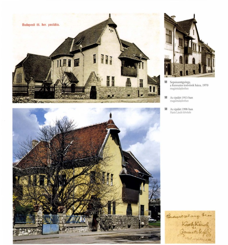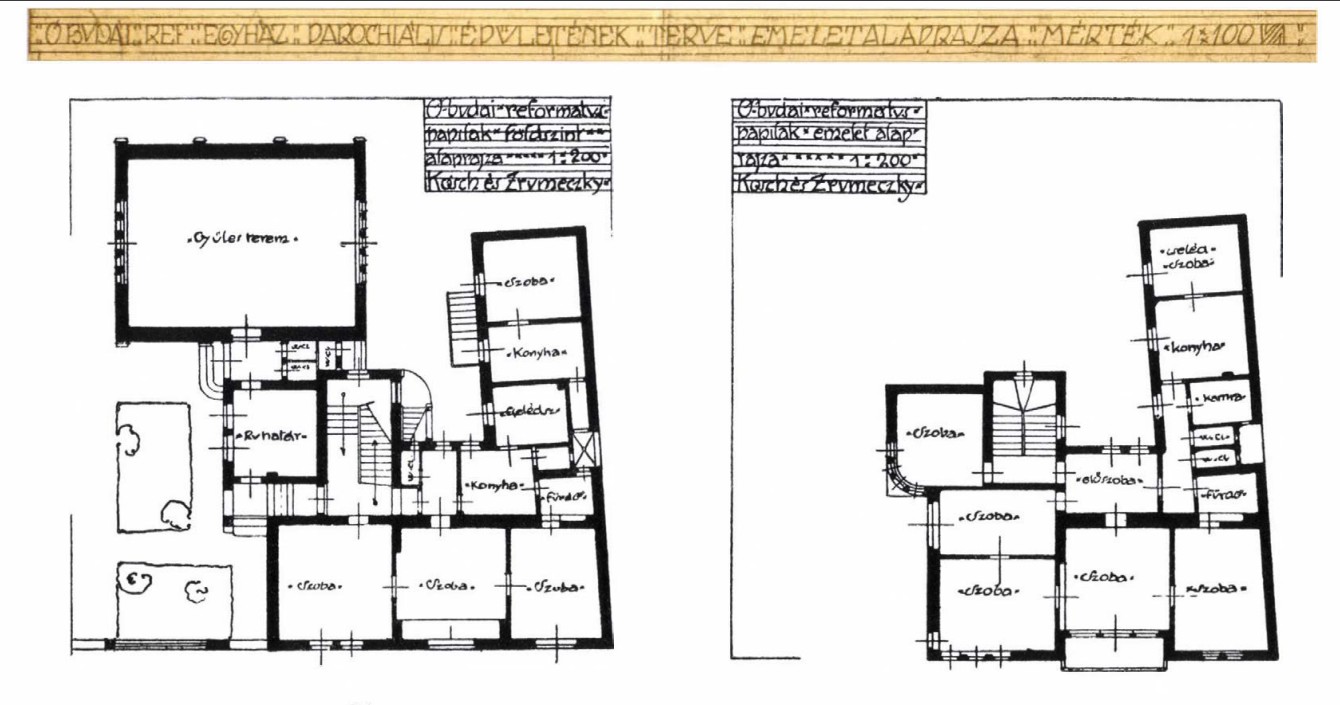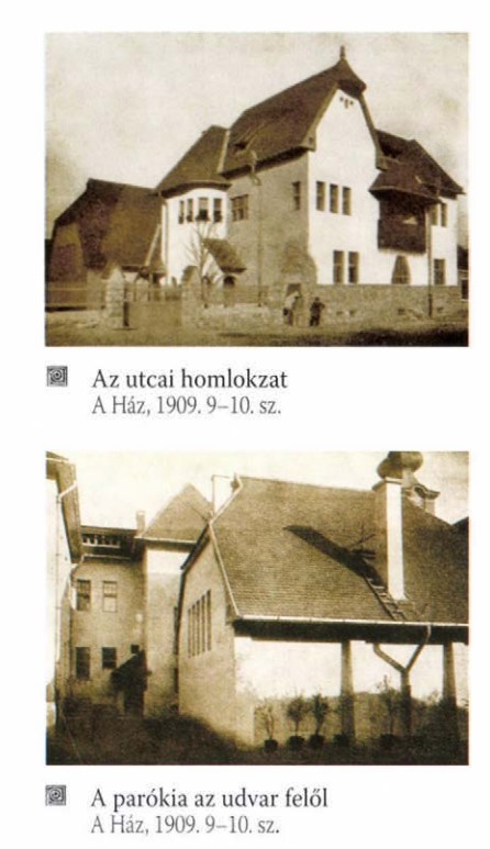 Új parókia és imaház tervezésére kő- és léckerítéssel, kapuval zárt udvarban az óbudai református egyház kurátora Neuschloss Kornél építész, aki fővárosi bizottsági tag is volt, az irodájában nála dolgozó Zrumeczky Dezsőt kérte fel. Zrumeczkynek egyedül nagy munka lett volna, ezért közös munkát ajánlott barátjának, Kós Károlynak. A tervezésre 1908 tavaszán kaptak megbízást és az építkezés ősszel kezdődött. Az épület jellegzetessége a mai is látható, főhomlokzaton kiugró, festett, faszerkezetes erkély. A munka eredményességét bizonyítja, hogy Neuschloss építőbizottsági tagként Kóst és Zrumeczkyt ajánlotta a Fővárosi Állat- és Növénykert tervezésére is. A második világháborúban azonban a Kós–Zrumeczky épületeket átépítették, így azok sajnálatos módon elvesztették eredeti arányaikat, szépségüket. A templom viszont ma is úgy áll, ahogy eredetileg megépült.