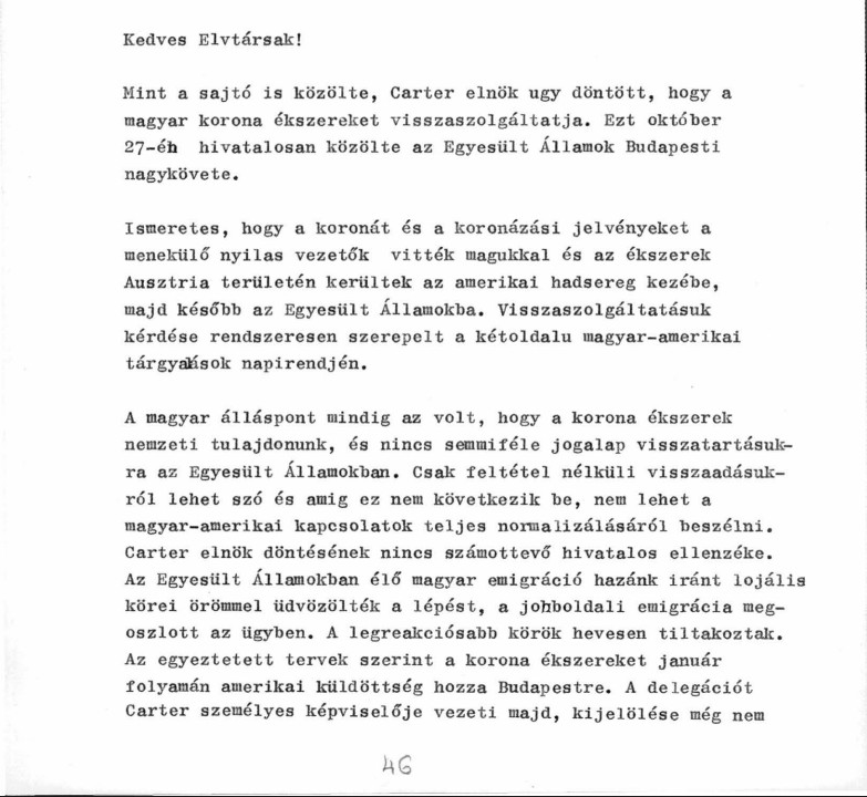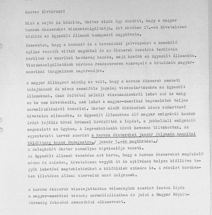 1978. január 6-án ünnepélyes keretek között adta vissza az USA hivatalos küldöttsége a magyar koronát a magyar népnek az Országház kupolacsarnokában.