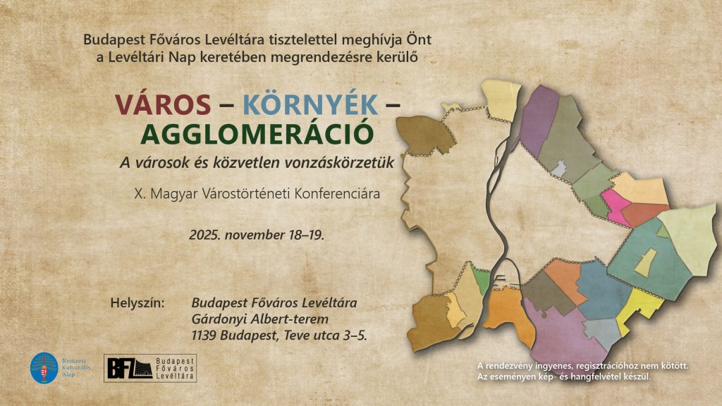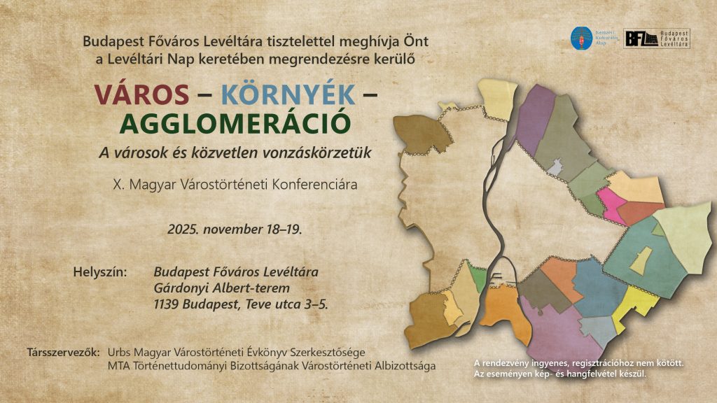 Budapest Főváros Levéltára, az Urbs Magyar Várostörténeti Évkönyv Szerkesztősége és a MTA Történettudományi Bizottságának Várostörténeti Albizottsága 2025. november 18–19-án Város – környék – agglomeráció. A városok és közvetlen vonzáskörzetük címmel rendezi a X. Magyar Várostörténeti Konferenciát, amelynek helyszíne Budapest Főváros Levéltára Gárdonyi Albert-terme (1139 Budapest, Teve utca 3-5.).