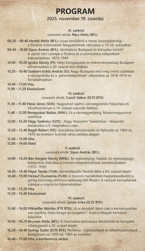 09.40 – 10.00 Sipos András: Vámháború Budapest és környéke között? A városi vám szerepe a főváros és a szomszédos települések kapcsolatában, 1873–1949